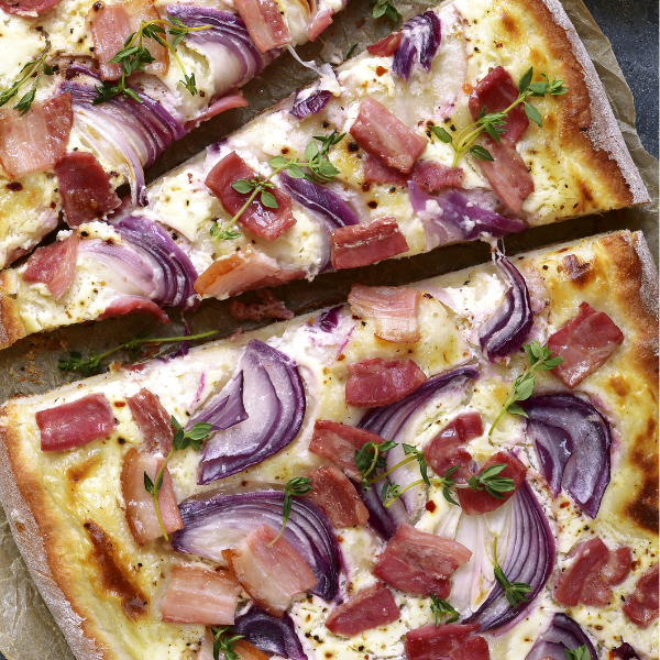 crème Pecorino Romano, ei, spek, Porchetta, rode ui, Comté, Emmentaler, persillade, bieslook